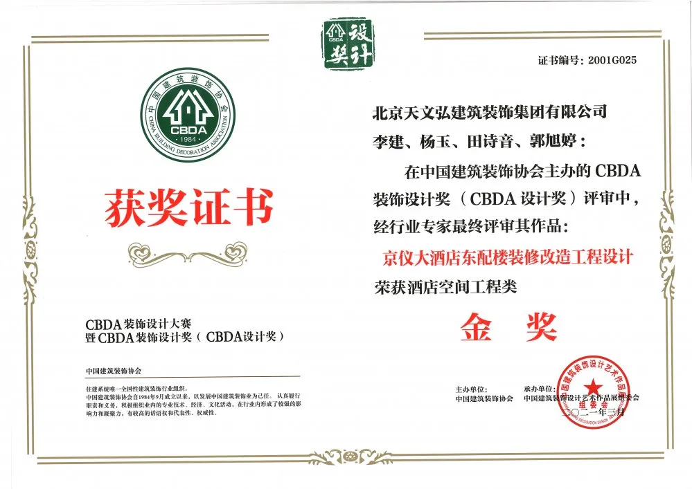 恭喜我司設(shè)計(jì)團(tuán)隊(duì)在中國建筑裝飾協(xié)會(huì)主辦的 CBDA裝飾設(shè)計(jì)獎(jiǎng)評審中,經(jīng)行業(yè)專家最終評審其作品“京儀大酒店東配樓裝修改造工程設(shè)計(jì)”榮獲酒店空間工程類金獎(jiǎng)。